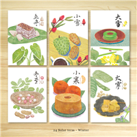 搭配節氣與食材為主題,運用版畫風格呈現不同季節的蔬菜或飲食。介紹台灣在地食材。喚起季節變換之間的味覺記憶! 搭配依序為,立冬:芋頭、小雪:釋迦鳳梨/洛神花咖啡、大雪:紅豆、冬至:花生、小寒:橘子、大寒:黃豆。