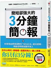 【國際好評如潮】「如果大家都能效法布蘭特.平維迪克,在三分鐘內成功提案,好萊塢在午餐前就能搞定所有工作。我在此鼓勵所有靠簡報討飯吃(甚至偶爾要做簡報)的人,好好讀這本書,懷抱書中蘊含極具意義,又中肯的簡報技巧。」──凱文.貝格斯(Kevin Beggs),美國獅門娛樂集團(Lionsgate Television Group)董事長「我的整個團隊都必讀此書。這本書的內容徹底改變了我們溝通、銷售和行銷模式。」──喬桑.托斯(Joe Santos),美國銀行美林證券(Bank of America Merrill Lynch)董事兼區主管「我曾在最難搞定的場合見過布蘭特,他是簡報界天王無誤。希望讓簡報更有效、更難忘的人一定要讀這本書。」──莉姿.潔特莉(Liz Gateley),思播有限公司(Spotify)創意開發主管「布蘭特創造了三分鐘法則,因此馳騁娛樂界。現在我們可以把這套規則應用在任何產業、任何簡報和任何觀眾上,同時享受驚人的效果和成功!」──史提夫.帝漢尼(Steve Tihanyi),美國通用汽車(General Motors)前總經理「這本書我只讀到一半,就已在三場會議中應用這套原則。這本書最契合現在社會的需求。」──麥可.格魯伯凱(Michael Gruber),美國凱撒娛樂(Caesars Entertainment)新事業部執行長「我觀察布蘭特實踐這套法則將近二十年。對商務人士來說,他的專業和個人魅力使這本書富含娛樂性、資訊性和必要性。」──大衛.加芬克爾(David Garfinkle),美國電視節目《原始生活二十一天》(Naked and Afraid)執行製作「布蘭特不斷地打造出最具創意又最難忘的簡報,因此獲得了良好的名聲。現在大家可以向他學習,實踐這本書的內容了。」──保羅.布凱里(Paul Buccieri),美國A+E電視網(A+E Networks Group)總裁「擁有絕佳的構想只是第一步。布蘭特最爐火純青的功夫,就是將構想傳達給全世界,讓大家興奮地買下節目。現在大家在書中,也可以學到他這套簡單、又好懂的方法了。」──布萊德.富勒(Brad Fuller),美國白金沙丘製片公司(Platinum Dunes)合夥人「想讓簡報有效又難忘的人必讀的一本書。」──湯尼.狄聖托(Tony DiSanto),美國音樂電視網(MTV)前節目總裁「本書讓我們學到所有人都能學得更好的重要一課。」──強納森.穆雷(Jonathan Murray),美國BMP節目製作公司(Bunim/Murray Productions)創辦人「布蘭特和這本書確切地說明,要如何用最簡單的方式將想法傳達他人、達成目標。」──傑夫.加斯潘(Jeff Gaspin),美國全國廣播公司(NBC Universal Television Entertainment)前董事長「我敢打包票,布蘭特是我合作過最棒的夥伴,本書是他有史以來最棒的傑作。」──漢克.科恩(Hank Cohen),美國米高梅環球電視集團(MGM Television Entertainment)前總裁「本書是溝通聖經,簡報適用,終身也適用。」──湯姆.謝爾曼(Thom Sherman),美國哥倫比亞廣播公司(CBS Entertainment)節目部資深執行副總裁「我擔任購片人員時,看過幾千場簡報,就屬布蘭特的最讓人難忘。在他講述大綱時,總有辦法把最複雜的概念講得簡單又好懂。」──約翰.薩德(John Saade),美國廣播公司(ABC Entertainment)另類影集、特別節目及深夜節目前執行總裁「我經常被問到:『要怎麼提出概念比較好?』現在我可以簡單回答:『一定要讀這本書,而且要徹底實踐才行。』」──喬恩辛.克萊爾(Jon Sinclair),美國歐普拉電視網(The Oprah Winfrey Network)節目開發執行副總裁「我親眼目睹布蘭特舉重若輕地展現堪稱最難掌握的技巧。本書也是如此。」──帕拉格.馬拉迪(Paraag Marathe),美國美式足球舊金山四九人隊(49ers Enterprises)總裁兼營運部執行副總裁「商業書籍很少讀起來這麼有趣、實用又深入。本書是所有想做任何提案或簡報的必讀書籍。」──比爾.華爾席(Bill Walshe),美國總督飯店集團(Viceroy Hotel Group)執行長「布蘭特讓大家明白,現代溝通科技已大幅改變。吸引大家聆聽你的想法,真的是一門溝通藝術。和我看過絕大多數的業界專家相比,我認為布蘭特對如何大幅提升溝通效果的思考最深入,概念也最豐富。」──大衛.韋爾德四世(David Weild IV),美國股票交易所納斯達克(NASDAQ)前副董事長「把這本書讀了一次,再加上短短的三分鐘後,當我講述自己的案件及和解概念,或者對我生活中的決策者(法官、陪審團甚至是反方律師)倡導某項概念時,我的倡導技巧大幅提升了。」──羅賓.薩克斯(Robin Sax),前加州洛杉磯檢察官「就算你有全球最棒的概念,如果不懂得怎麼簡報,又有什麼用?本書提供了必要的技巧和信心,讓你擁有完美的簡報。」──派翠克.卓瑞克(Patrick Drake),德國宅配生鮮公司HelloFresh共同創辦人「只是簡短還不夠。本書講的是在提案或簡報時,要清晰、簡潔地創造價值。」──希爾薇.迪.朱斯托(Sylvie di Giusto),國家演講者協會(National Speakers Association)認證專業演講者、主講人兼前任紐約分會總裁「本書的內容太讓我震驚了,不過其實也在意料之中。從布蘭特剛來洛杉磯開始,我就不斷看他做提案。我向來覺得他具備非常獨特的能力,能以清楚、簡潔和有力的模式傳達概念。看來他想出該怎麼把祕訣傳授我們了。」──麥特.華登(Matt Walden),履諾集團(The Make Good Group)負責人「如果身邊沒有本書,今天我就不會提案。」──布萊恩.克里斯提亞諾(Brian Cristiano),美國廣告代理公司波德全球(BOLD Worldwide)執行長「本書會將改變你個人和專業溝通的方式。」──班尼.姆丁(Ben Nemtin),《你死前想做什麼?》(What Do You Want to Do Before You Die?)共同作者