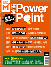 004 「剛剛好」的簡報才高明 006 別再做出只有字、很多字的投影片了! 講重點、圖像化,讓觀眾對你目不轉睛PART1 基礎篇012 確認目標、對象與時間 思考「自己和對方要什麼」,釐清簡報目的 016 構思內容 別急著開電腦,先想你到底要說什麼 018 資料取捨、濃縮要點 只放要點、關鍵字,控制投影片資訊量 022 3種常用圖表:線型圖、直條圖和橫條圖 條圖與線圖淺顯易懂,適用於趨勢分析報告026 3種建議少用的圖表:圓餅圖、立體圖、雙Y軸不是有圖表就好,錯用反而容易誤判資訊 030 常用圖解框架 用架構圖比較層次,以集合圖表示關係 034 常用簡報版型 挑選最合適的呈現形式,想傳達的論點一目瞭然PART2 進階篇042 顏色選用 同色系能帶出從屬關係,一張簡報最多4種色彩 046 文字規格 字級大於28、字型限3種,閱讀最流暢舒適050 頁面留白 設計過多易分散注意力,善用空白凸顯關鍵資訊 053 善用對比 用「親疏遠近」凸顯重點,觀眾自然集中焦點 056 圖片運用 避開10種圖像錯誤擺放,讓文字訊息跳出畫面 060 少用表格 以「熱區圖」取代框線,突出資訊重點 062 動畫設計原則 管理元素出現的節奏,引導觀眾注意力 066 懶人包 14張投影片,總結做簡報的祕訣PART3 實用小祕技070 快速存取工具列 高手都自訂常用功能:神速做簡報 072 母片 統一調整版型、字體,放Logo和頁碼也靠它 074 SmartArt 內建資料圖框,幫你把文字圖像化 076 內建範本:時間軸、流程圖、資訊圖表 套用模板、節省製表時間,快速完成美觀、實用的簡報 080 常用快速鍵 掌握製作和投影3種組合鍵,效率高、不出錯 084 進階設定 增加預設復原次數,做錯後悔也不怕改 085 存檔設定 先壓縮圖片再寄出,縮小檔案容量 086 Word轉PowerPoint 想把文件變簡報,如何快速搞定?PART4 免費工具包090 下載免費模板-4個網站蒐集上千種模板,搞定各種專業簡報092 商用icon-善用圖示取代文字,統一色彩更整齊094 翻譯簡報-文字自動轉換成不同語言中、英文都難不倒你