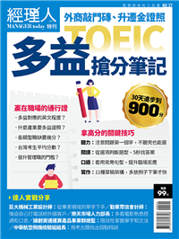 006 答案都給了,還不考試?008 轉職、升遷的敲門磚用一張英文證照,驗證商務溝通的軟實力PART1 基礎篇010 認識多益測驗商用英文考題多,契合企業所需014 6個常見疑惑哪類型的工作者需要多益成績?018 目標450分降低念英文恐懼,找有興趣文章練習021 目標650分專攻聽力測驗,擴充商業詞彙量024 目標800分熟練解題技巧,留時間給長文閱讀028 目標900分平時整理同音、 同義詞,避開陷阱題PART2 技巧篇032 聽力搶分攻略從答案研判題型,一聽就找出關鍵內容036 破解閱讀測驗略讀、掃描文章,掌握主旨句意就能作答040 口語測驗訣竅答題最長不超過1分鐘,回覆句子簡單為主043 寫作重點摘要撰文架構先想好,多放例子下筆更迅速046 翻譯精準搜尋巧妙運用Google翻譯,正確英文30秒現身050 學習持續關鍵練發音、看新聞、聽演講,1分鐘跟著BBC學好英文PART3 實戰篇056 沒時間提升英語能力?一邊工作、一邊準備,多益照樣拿高分058 輝瑞大藥廠打造無壓力英語學習環境059 日本樂天集團將英語視為「重要工作」060 巨大機械工業設計師 徐珮瑜以英語分享工作理念,多說就能掌握關鍵字062 中華航空飛機檢驗組值勤組 李鑑唐針對英文弱點特訓,一次考過得到外派機會064 緯創資通運算產品事業群事業部V總監 曾世傑為每一次考試設立更高目標,預備下一次升遷的入場券066 勤業眾信聯合會計師事務所會計師 吳世宗從工作中磨練聽說讀寫,取得多益990滿分068 樂天市場人力部長 范君儀學英文不能膽小,主動找練習機會才能進步070 福祿遠東機械工程師 潘致翔英文就像救命繩,幫你攀著向上爬通往理想工作072 資誠聯合會計師事務所審計服務協理 李冠慧爭取外派、驅動持續學習,敢開口、英文實力大躍進074 自製英語資料庫、創造驗收機會用人生閱歷加分,3大優勢,40歲後更要學英文076 大量閱讀大量聽,進步不二法門勉強生樂趣、聽多成自然,讓英文成為表現自己的起點078 《新多益測驗短期特訓班!》作者 杉村健一零碎時間固定用來學英文,半年從325分進步到885分079 《30天900分無往不利的超速習法》作者 濱口達史規畫每周學習比重,30天考到多益900分